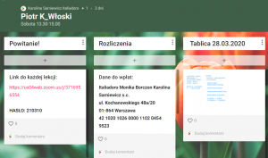 Żeby nie było bałaganu wszystkie wspomniane materiały (włącznie z tablicami z zajęć) ładujemy na konto ucznia w specjalnie przeznaczonym do tego programie, przypominającym wirtualną ścianę. Każdy kursant posiada tam indywidualne konto z hasłem, przypisane wyłącznie dla jego kursu.